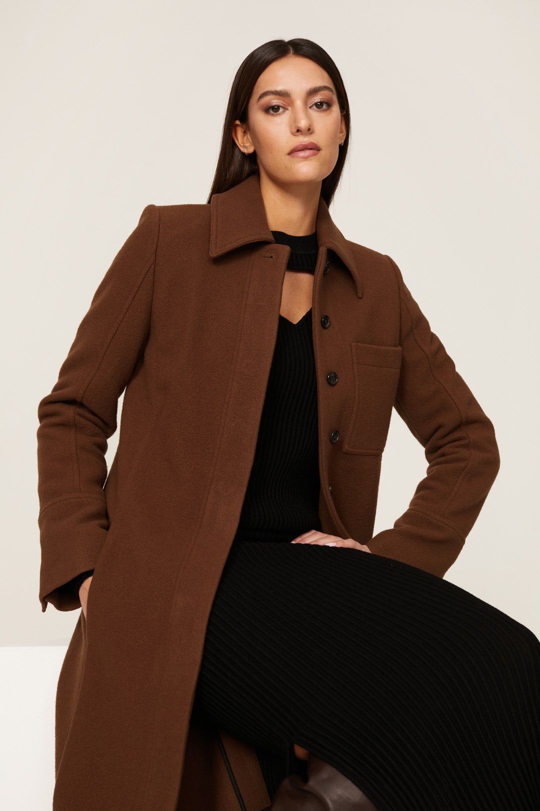 Columnar floor-length silhouette in rich chestnut, featuring a pointed collar, concealed placket, chest welt pocket, and clean bell cuffs.