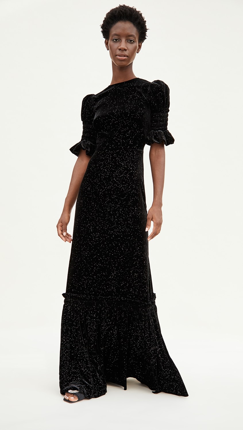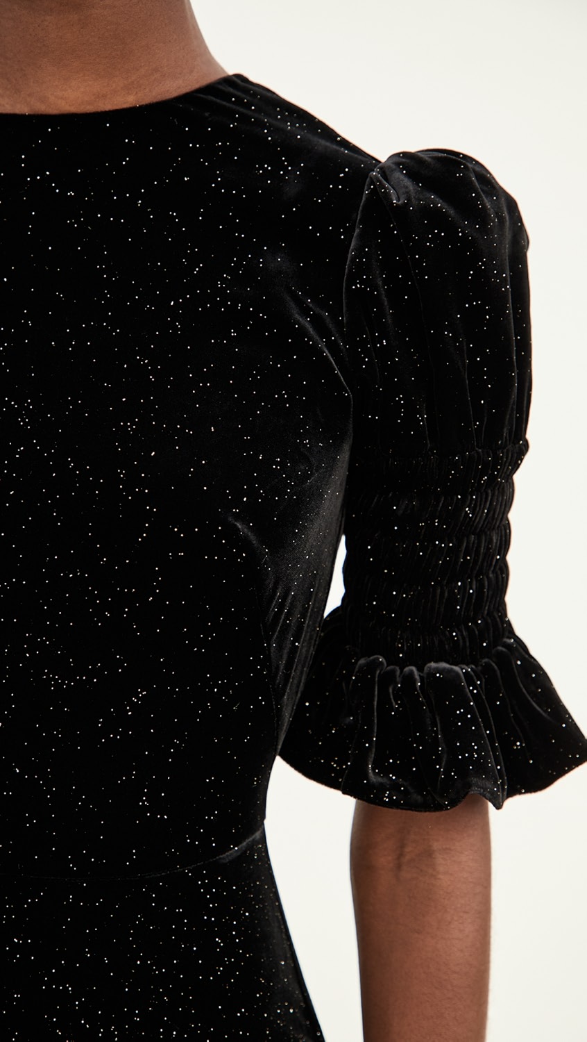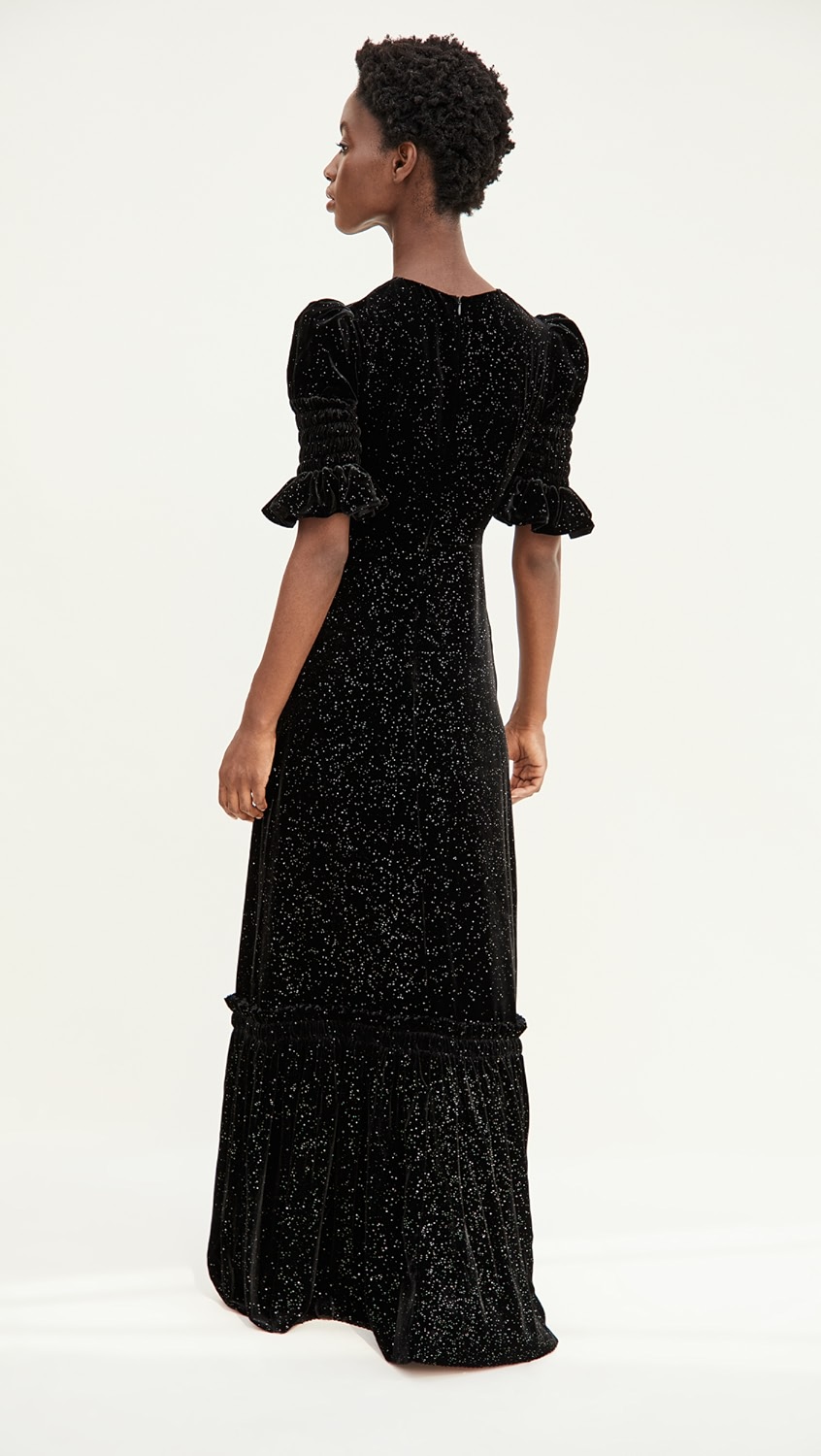 The Vampire's Wife Night Flight Dress features short puff sleeves with smocked elastic cuffs. Glitter velvet with ruffled hem.