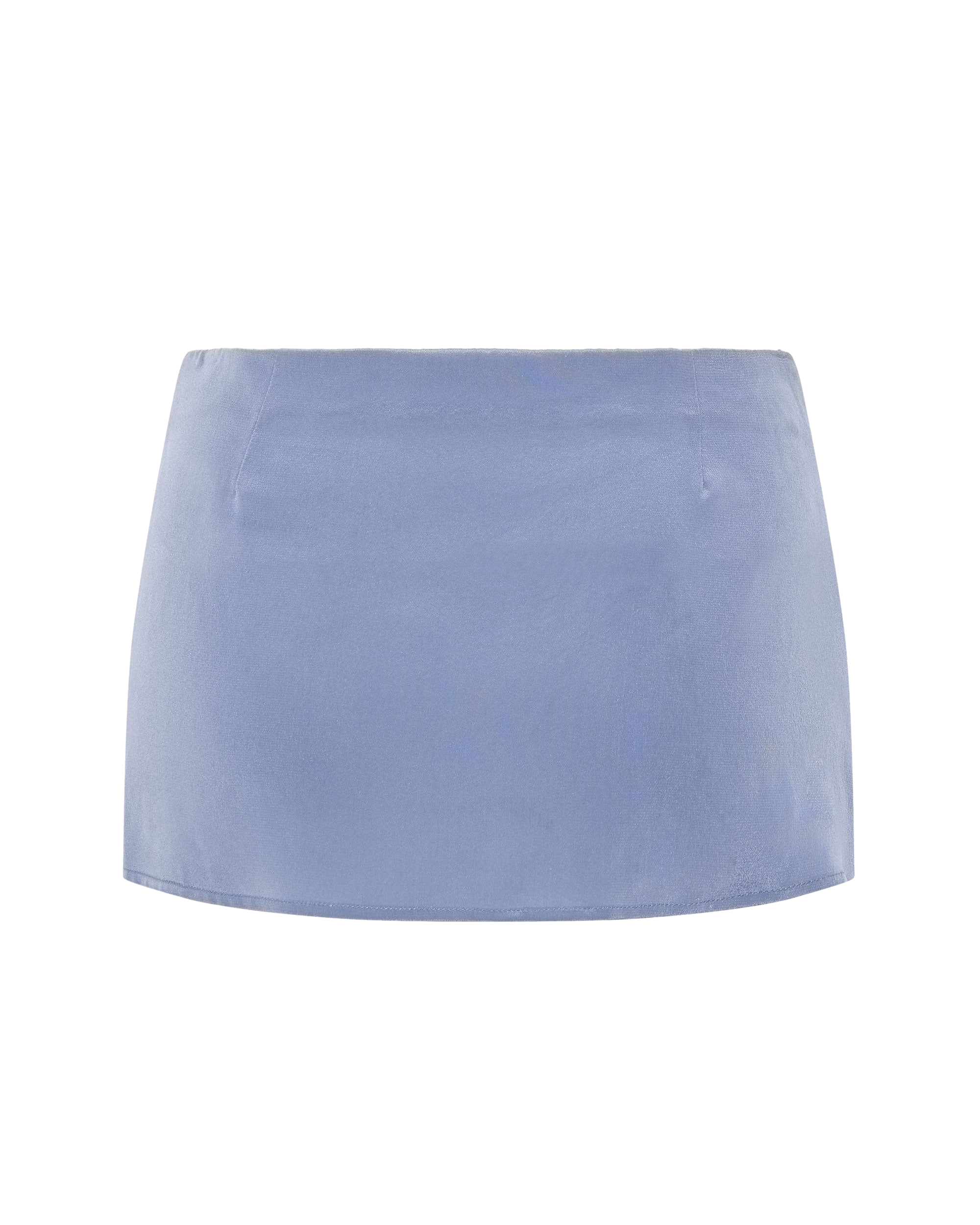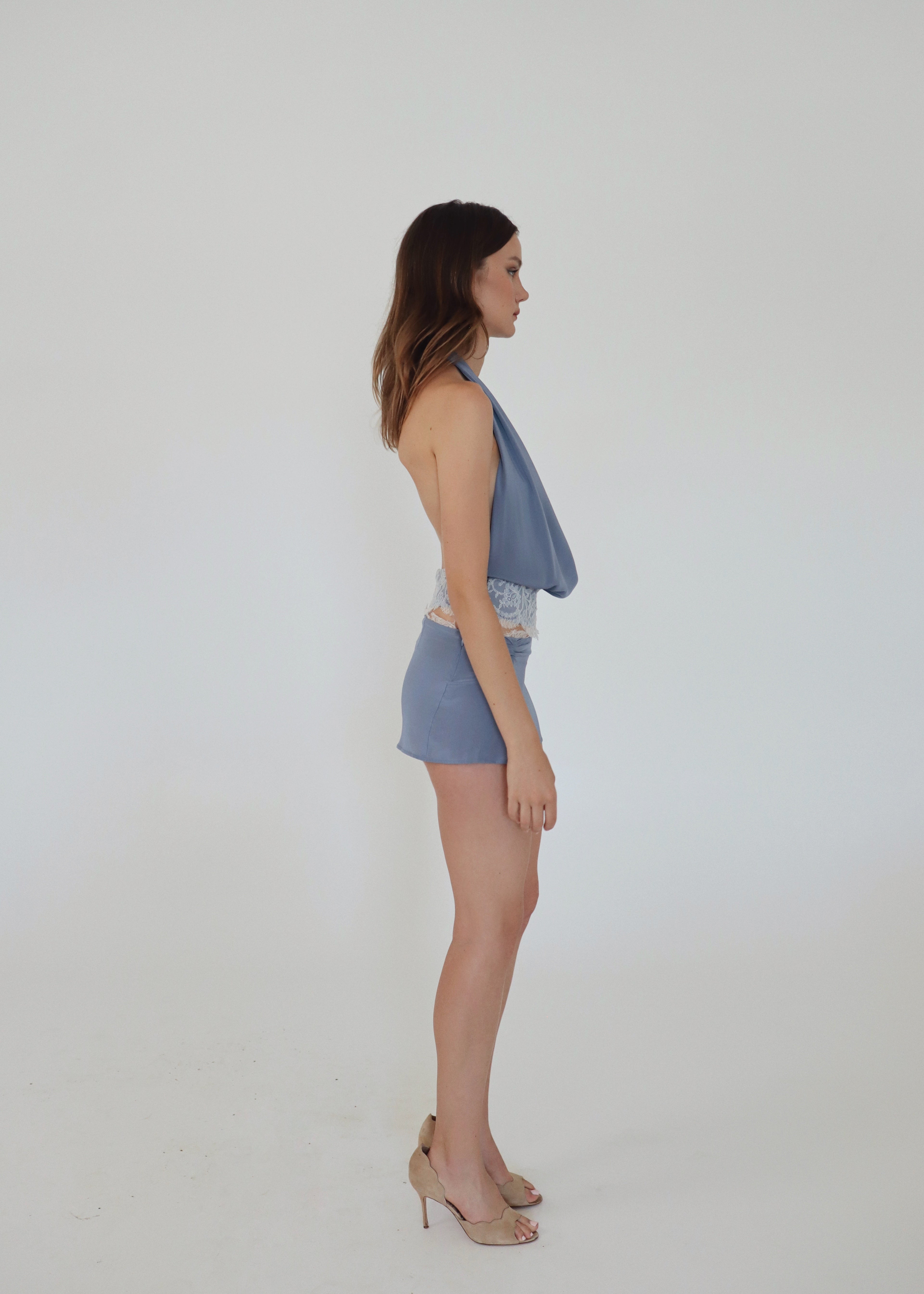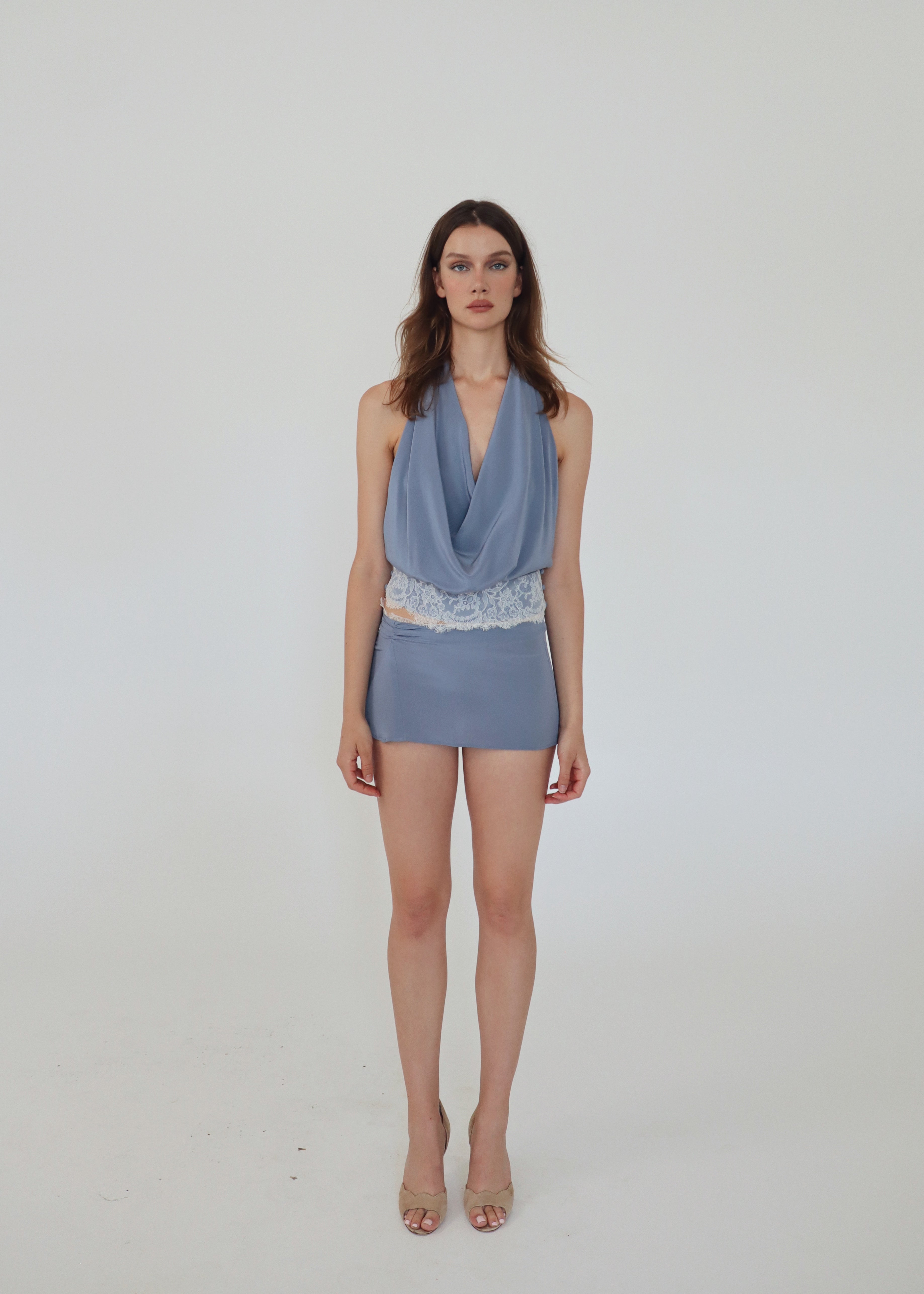 Draped periwinkle satin mini skirt with asymmetric ruching at the hip and ivory lace trim at the waistband.