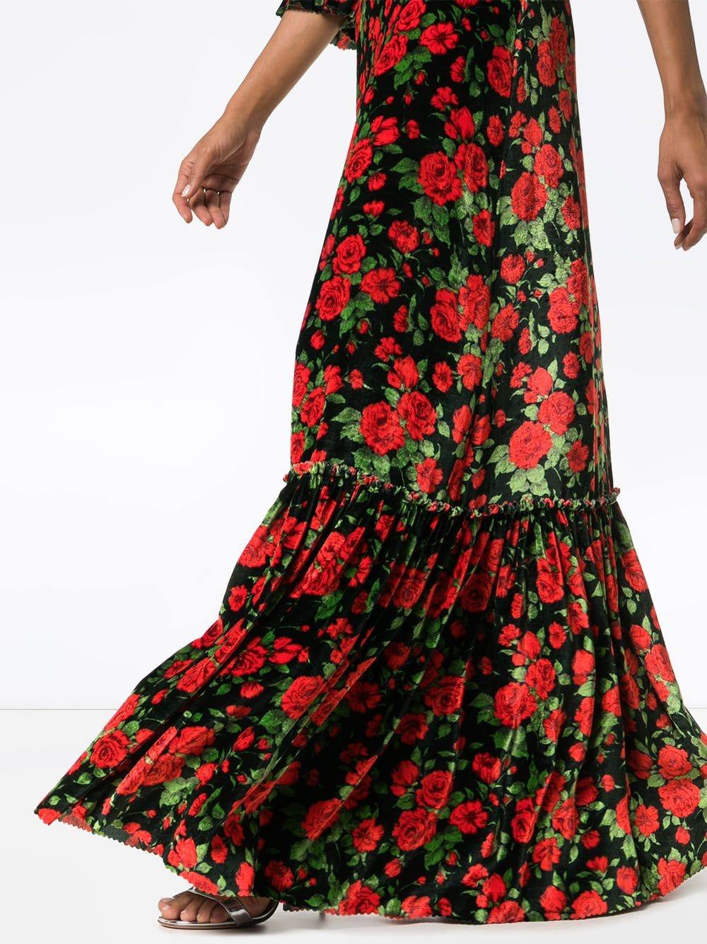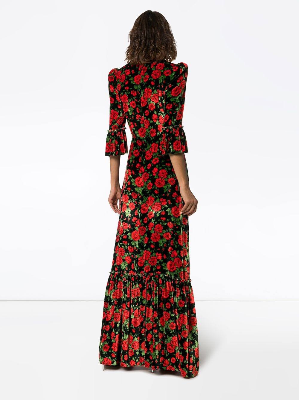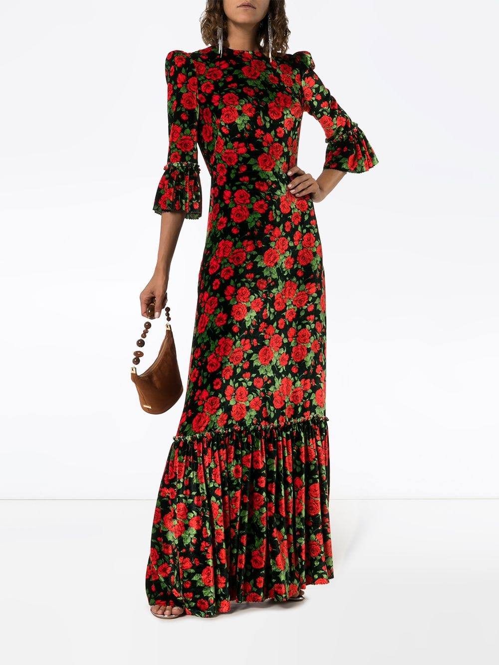 The Festival Dress by The Vampire's Wife featuring a mid-length design, round neck, rose print pattern, elbow length, ruffle trims, cinched bodice and a concealed zip fastening. Worn by Caitriona Balfe at the British Independent Film Awards 2019.