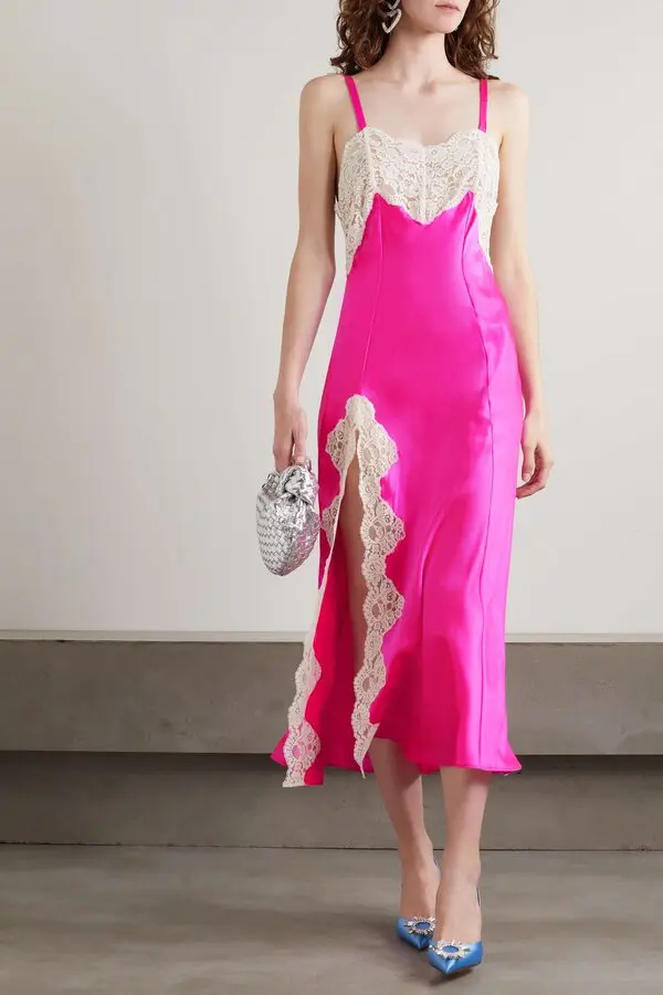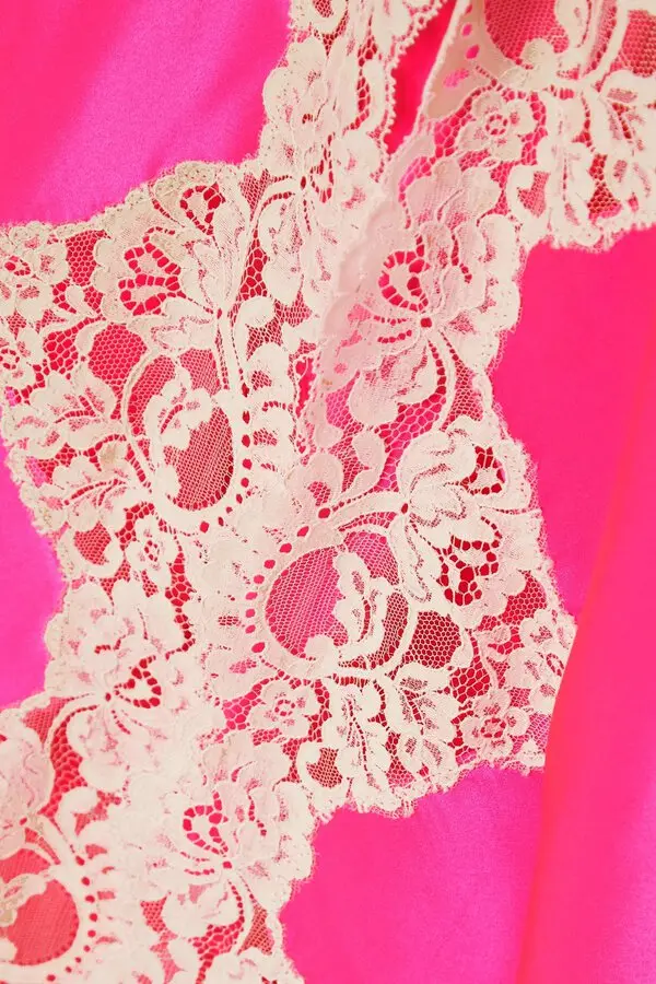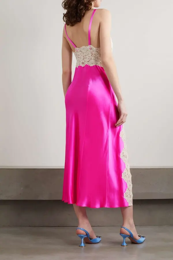 Magenta Silk Satin and Lace Bias Slip Dress