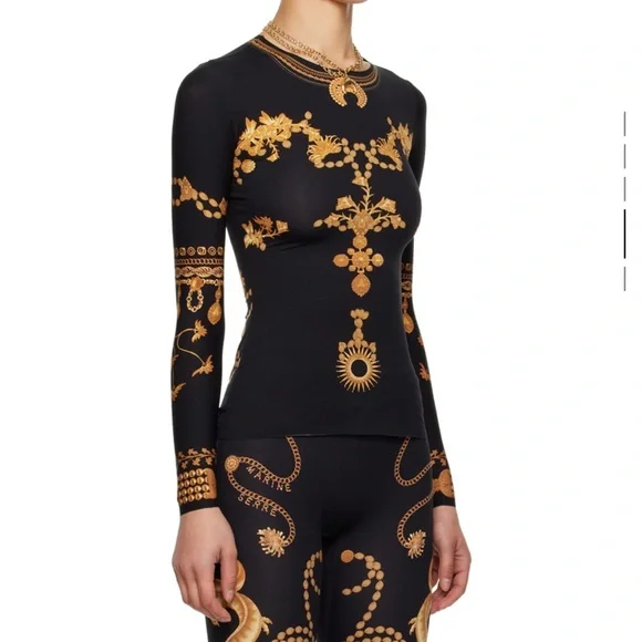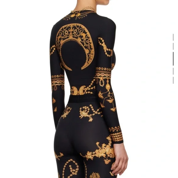 Body-skimming long-sleeve top in black with opulent gold baroque jewelry-print motifs evoking palatial grandeur.