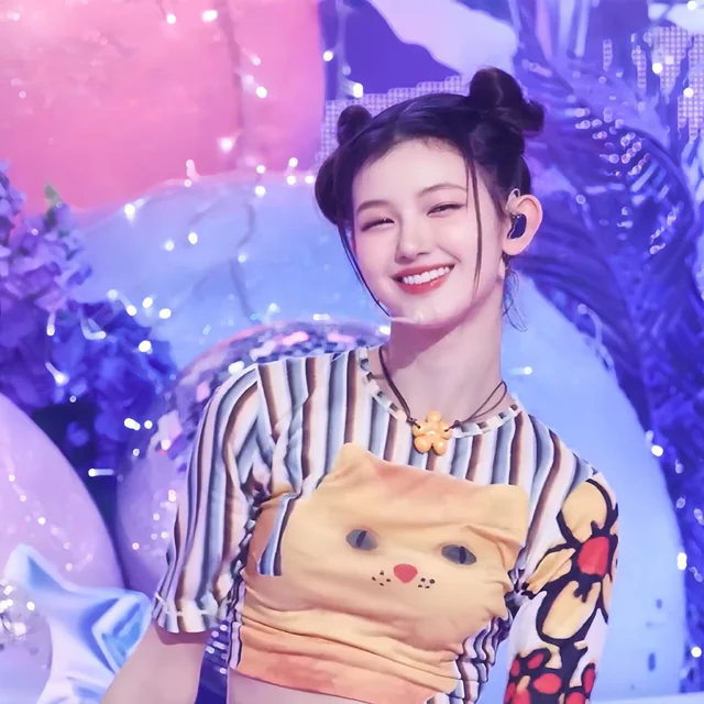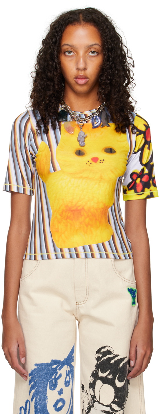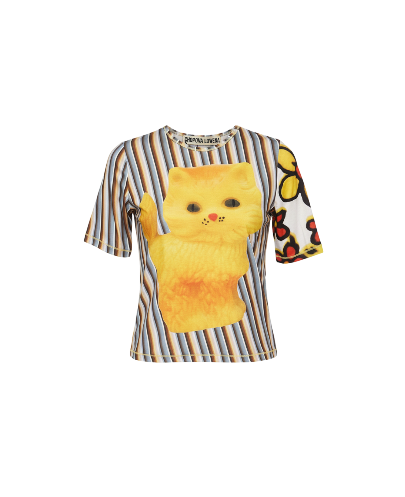 Mixed-print jersey tee pairing vertical stripes with a bold floral sleeve, anchored by an oversized kitsch kitten graphic at center front. As seen on Danielle Marsh in the New Jeans promotion.