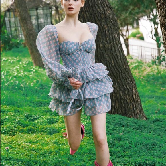 Corseted bustier bodice with lace-up front and tiered ruffled skirt in dusty blue floral organza with sheer balloon sleeves.
