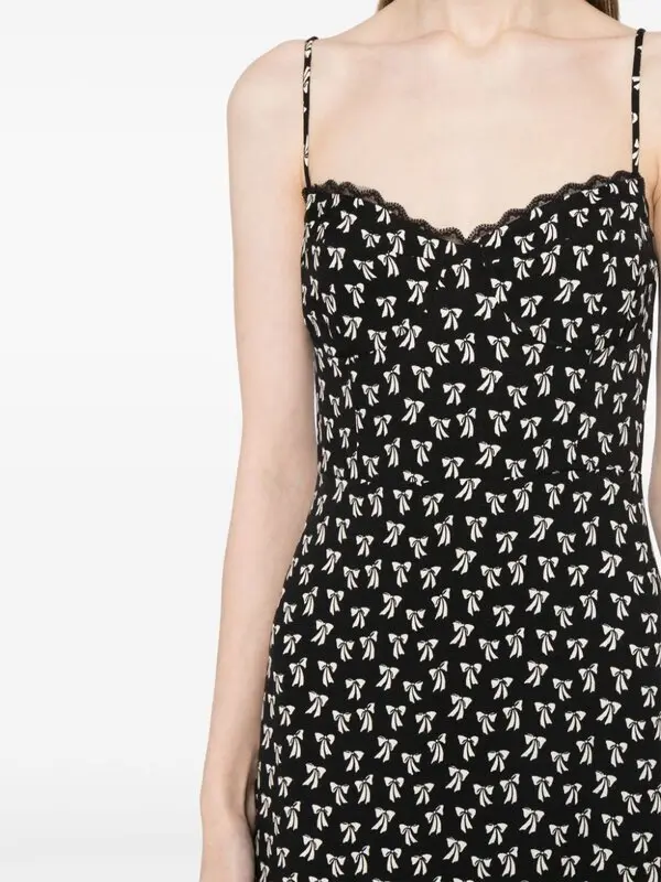 Body-skimming midi silhouette with a sweetheart bustier neckline, delicate spaghetti straps, and an allover black-and-white bow print.