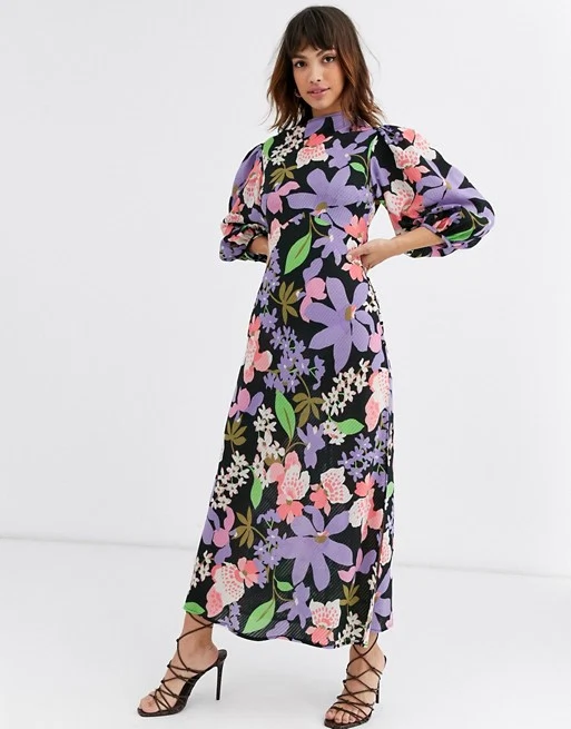 Voluminous puff-sleeve midi dress in a bold graphic floral on black, with a high gathered neckline and relaxed A-line fall.