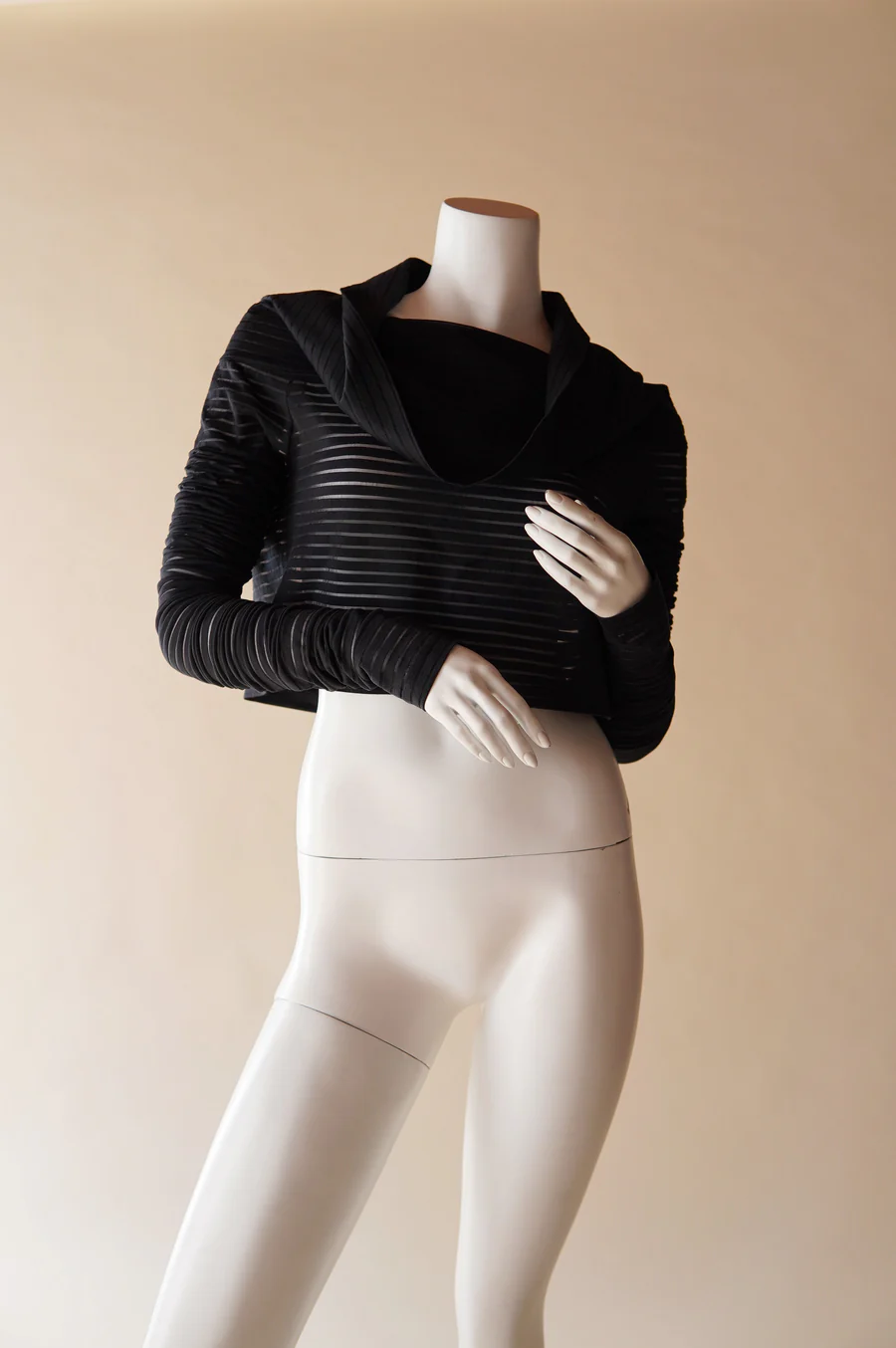 Sheer striped cowl-neck cropped top with a dramatic draped neckline and semi-transparent long sleeves, quintessential Romeo Gigli sensuality.