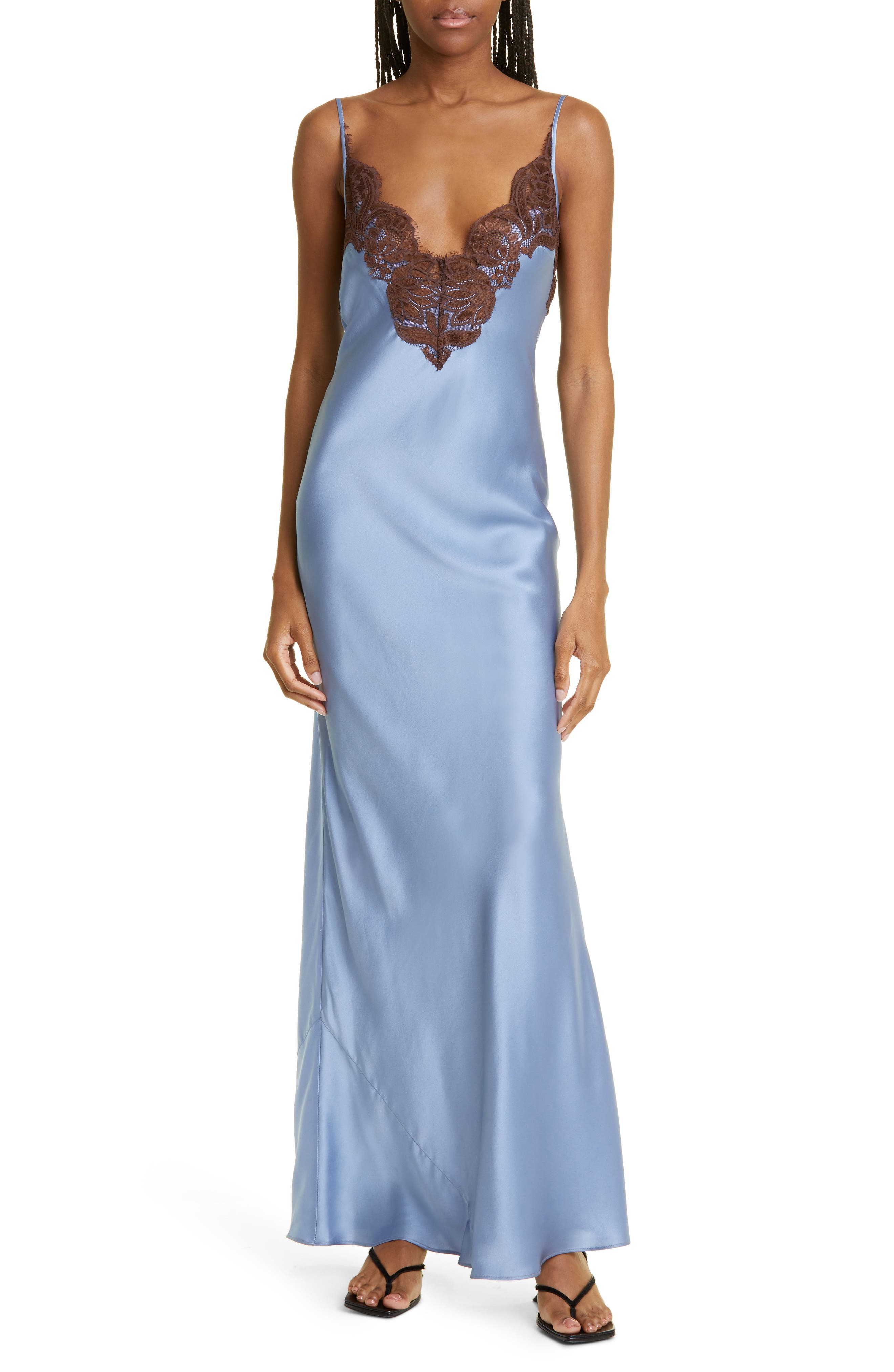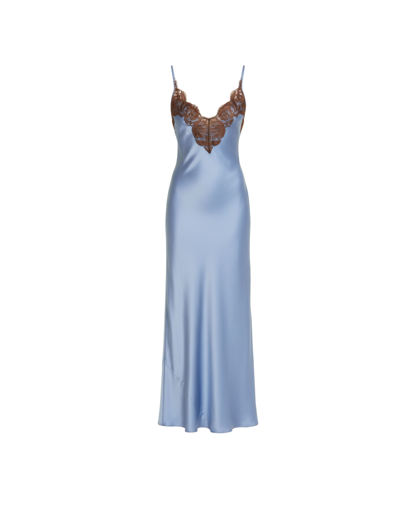 Fluid bias-cut silk slip dress in powder blue with contrasting chocolate floral lace appliqué at the décolletage and spaghetti straps.