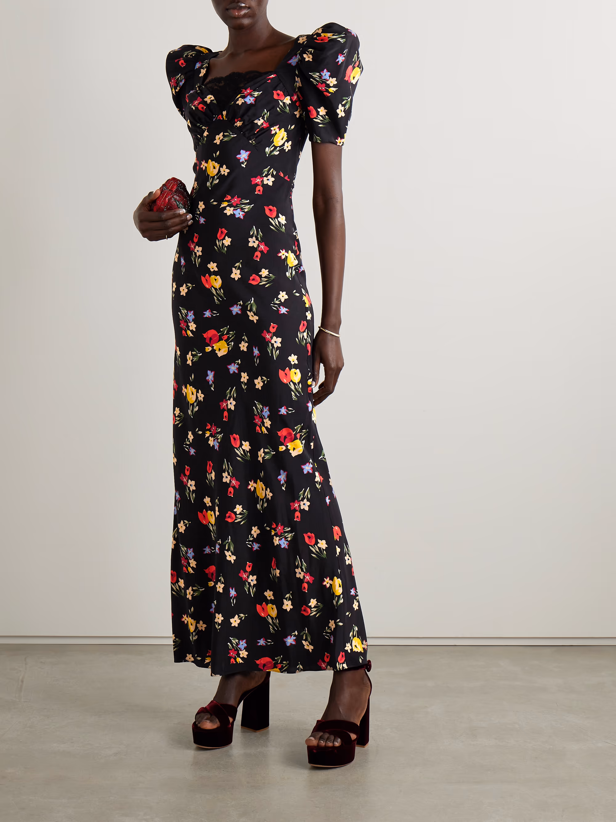Cut from silk crepe de chine, this dress is printed with vibrant flowers and has a lace-paneled V-neckline framed by puffed sleeves. Subtle gathering along the cups accentuate the small of your waist.