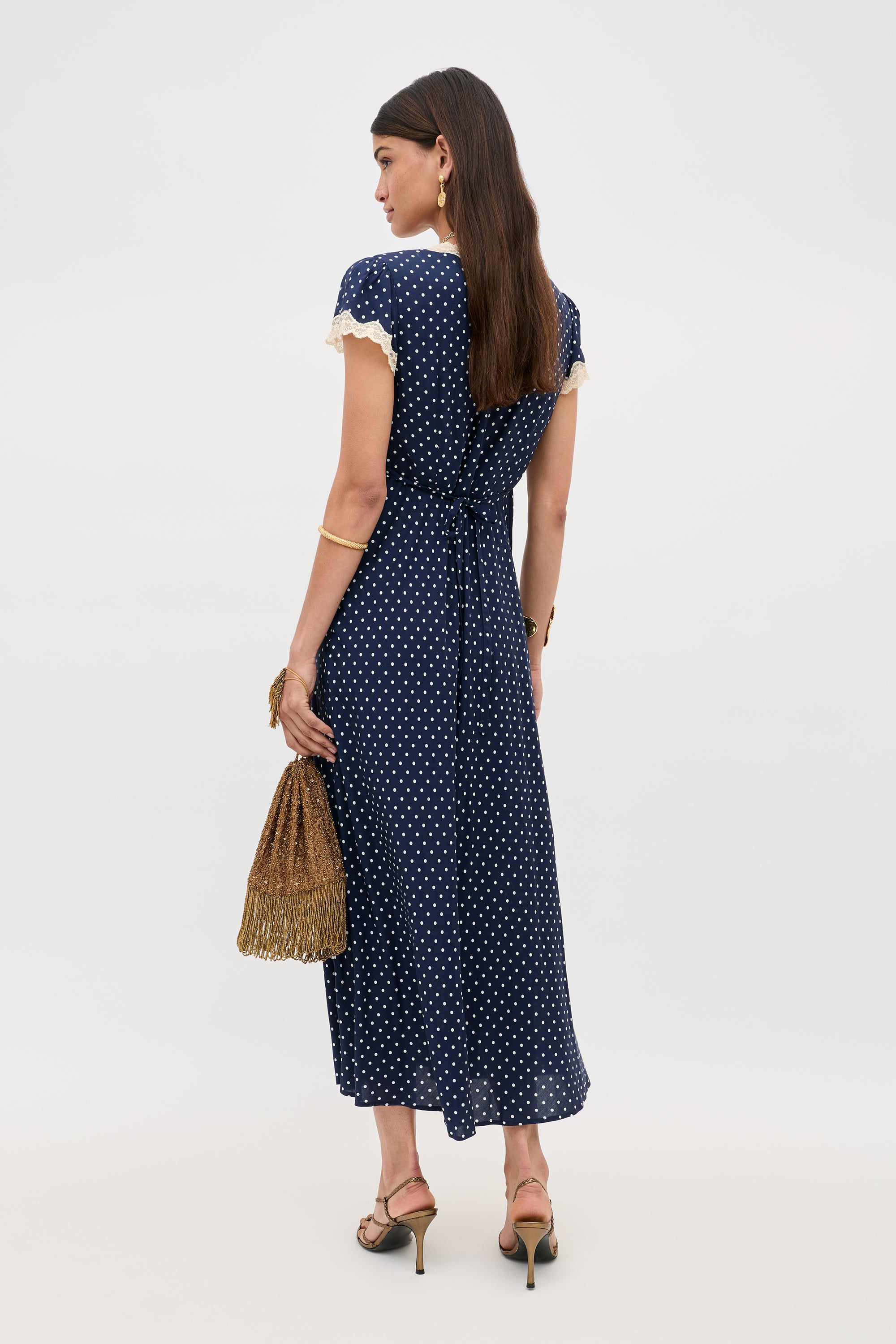 Lace-trimmed V-neckline anchors this navy polka-dot maxi dress, its fluid bias-cut silhouette evoking vintage lingerie elegance with flutter sleeves.
