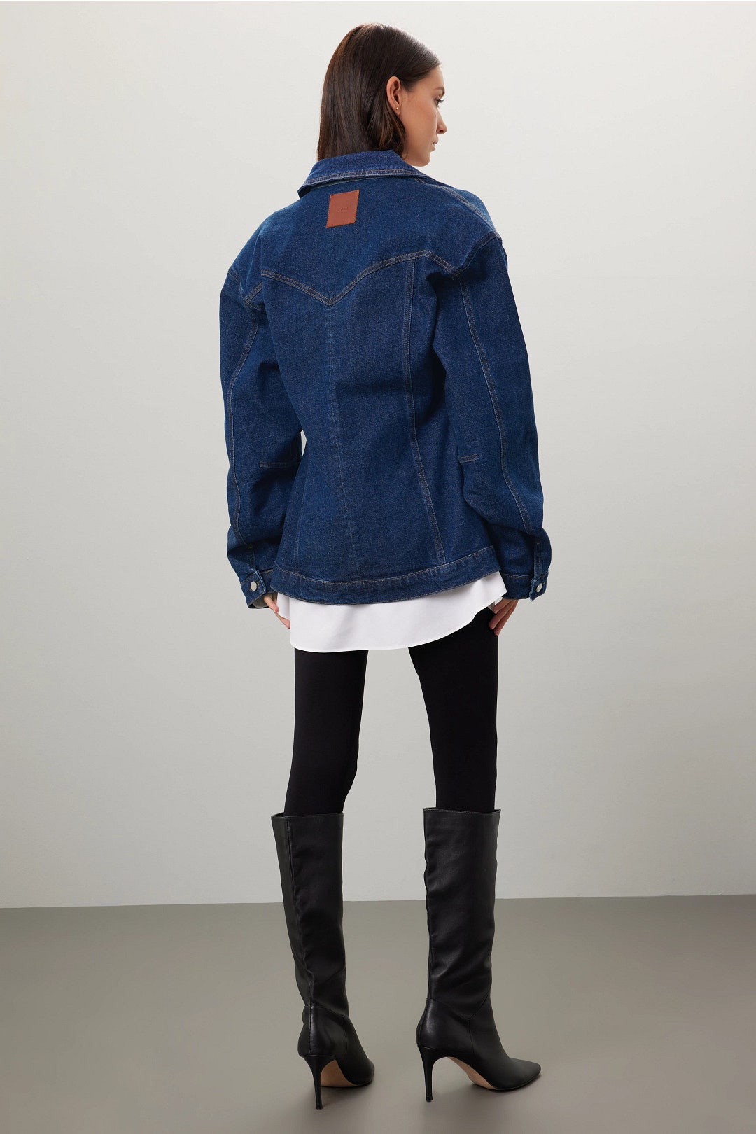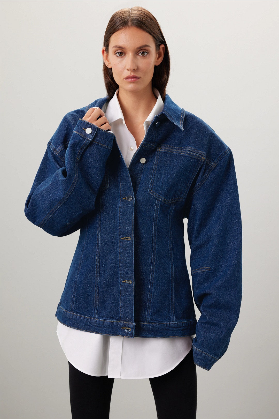 Sculpted dark indigo denim jacket with corset-inspired seaming, snap-button closure, and a nipped waist that elevates the classic trucker silhouette.