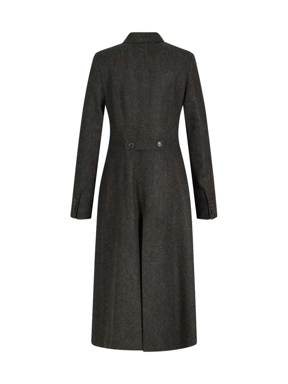 The Virginia is our Victorian inspired long coat. Darts run down the front and rear, making it the ideal choice for those wanting a more fitted silhouette. Additionally, two seam pockets and three hidden buttons adorn the front of the coat, whilst a small, double buttoned belt adorns the back.