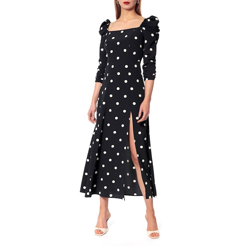 Square-neckline midi dress in black with bold white polka dots, featuring ruched puff sleeves and a fitted bodice flowing into an A-line skirt.